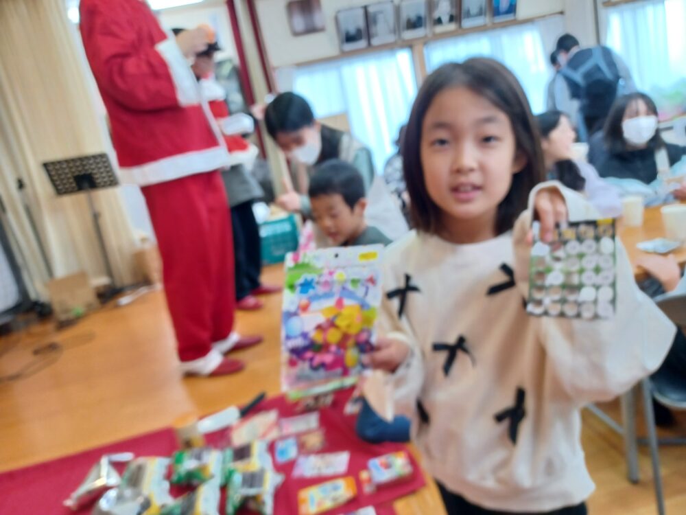 ビンゴゲーム では、先着60名の皆さんが参加。市内の 椿様 提供のお菓子やダイソーで購入した景品を用意。あちらこちらでビンゴ!の歓声がかかり、気に入った景品を受け取って笑顔があふれます。