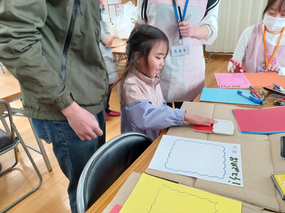 昨日、卒園した子やまもなく保育園や小学校で進級する子らが、好きな色の画用紙とスタンプを選んで手形押し。学生が名前などを書いて、「おめでとう」の言葉を添えて渡していました。