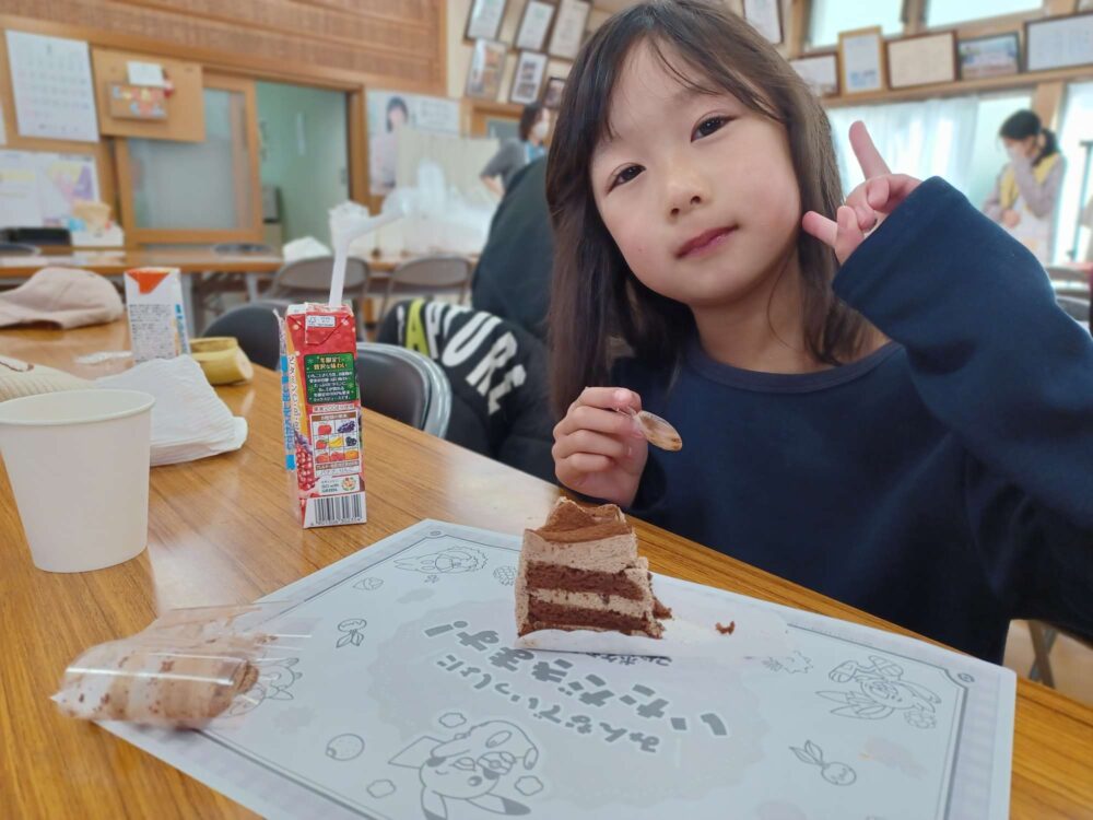 👧今日は、ぶたにくのカレーがおいしかったです。おいわいのケーキうれしかったです。ありがとうございました❗🐸